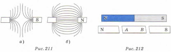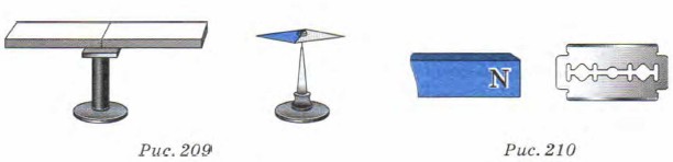2. Левым концом лезвия бритвы прикоснулись к северному полюсу магнита (рис. 210). Будут ли после этого обладать магнитными свойствами оба конца лезвия? 3. На рисунке 211 показаны линии магнитной индукции магнитного поля, созданного двумя постоянными магнитами. Определите полюс левого магнита и укажите направление линий магнитной индукции в каждом случае.