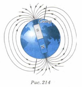 Глава 8. Электромагнитные явления § 60. Магнитное поле ЗемлиКакое взаимодействие называют магнитным? 1. Чем объясняется тот факт, что магнитная стрелка всегда устанавливается в строго определённом направлении? Почему один её конец ориентирован на север, а другой — на юг? Это связано с существованием магнитного поля Земли. В магнитном поле Земли магнитная стрелка устанавливается вдоль линий магнитной индукции этого поля. Объяснение причин существования магнитного поля Земли до сих пор остаётся до конца не разгаданным. Очень упрощённо магнитное поле Земли можно представить в виде гигантского полосового магнита, расположенного между Северным и Южным географическими полюсами. Южный конец этого магнита находится около Северного географического полюса Земли, а северный — вблизи её Южного географического полюса (рис. 214).