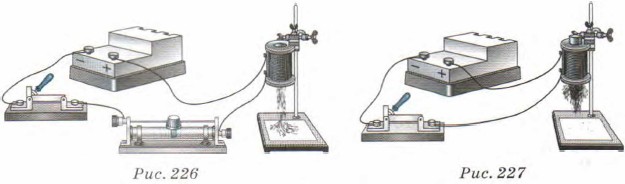 Действие магнитного поля катушки с током можно усилить во много раз (иногда во много тысяч раз), поместив внутрь катушки железный сердечник (рис. 227).