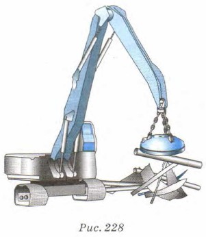 2. Электромагниты, благодаря возможности регулировать их магнитное действие, широко применяются в технике и в научных исследованиях. Например, электромагниты используют для подъёма и переноски тяжёлых стальных или чугунных изделий, для извлечения чёрных (содержащих железистые компоненты) металлов на свалках металлического лома (рис. 228). Электромагниты подъёмного крана обладают огромной мощностью.