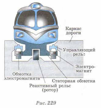 Во многих технических устройствах, таких как телефон, телеграф, электроизмерительные приборы, также применяются электромагниты. Ещё недавно казалось, что поезд на магнитной «подушке» — это дело отдалённого будущего. Сегодня такие поезда построены, в Китае и Японии они уже находятся в эксплуатации. Поезд (рис. 229) не имеет колёс, а «плывёт» над длинной магнитной полосой, заменяющей рельсы. Под магнитной полосой расположены мощные электромагниты, создающие необходимое магнитное поле. Электрический ток подаётся в эти электромагниты таким образом, что они ведут себя как двигатель, перемещающий поезд вдоль пути. Поезда на магнитной подушке не испытывают трения, не загрязняют атмосферу и практически бесшумны.