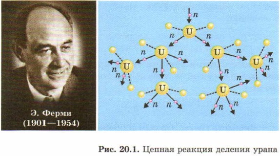 § 20. Ядерные реакции Цепная ядерная реакцияИтальянский физик Э. Ферми догадался, что с помощью нейтронов можно искусственно вызывать ядерные реакции деления. Дело в том, что нейтрон не имеет электрического заряда и поэтому он, не испытывая электрического отталкивания, может проникнуть в положительно заряженное ядро и вызвать его деление. Опыты показали, что реакция деления ядер урана, вызванная нейтронами, может стать самоподдерживающейся и даже лавинообразно нарастать. Дело в том, что при делении ядра урана могут испускаться 2—3 нейтрона. Попадая в другие ядра урана, эти нейтроны могут вызвать новые реакции деления. В результате число делящихся ядер может увеличиваться со временем или оставаться постоянным. Такую реакцию называют цепной ядерной реакцией. Она схематически изображена на рис. 20.1.