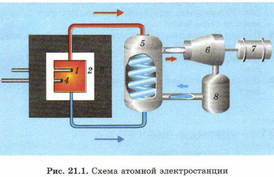 Сегодня атомные электростанции работают во многих развитых странах мира. Их доля в общем мировом производстве электроэнергии составляет около 15%. На рис. 21.1 схематически изображено устройство атомной электростанции. В активной зоне реактора 1 находится ядерное топливо. Активная зона окружена отражателем 2 и толстой защитной оболочкой 3 из железобетона. Реактором управляют с помощью регулирующих стержней 4. Они изготовлены из вещества, которое способно поглощать нейтроны. При запуске реактора эти стержни медленно выводят из активной зоны до тех пор, пока не начнется цепная ядерная реакция. А затем с помощью этих стержней поддерживается постоянство числа нейтронов, вызывающих деление ядер.