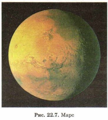 § 22. Солнечная система Планеты (окончание)МарсЭту планету назвали именем древнеримского бога войны за ее красноватый оттенок, обусловленный оксидами железа в марсианской коре. У Марса есть атмосфера, но давление вблизи поверхности этой планеты примерно в 150 раз меньше давления у поверхности Земли. Как и у Венеры, атмосфера Марса состоит в основном из углекислого газа.