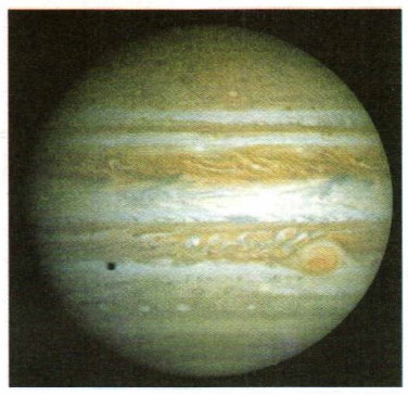 Планеты-гигантыОбщие свойства планет-гигантовНапомним, что планетами-гигантами называют Юпитер, Сатурн, Уран и Нептун. Масса любой из этих планет во много раз превосходит общую массу всех планет земной группы. Но в отличие от имеющих твердую оболочку планет земной группы, планеты-гиганты — это огромные газовые шары. Правда, из-за огромного сжатия, обусловленного силами тяготения, у них есть твердые ядра. У всех планет-гигантов есть спутники (их десятки), причем некоторые из них больше Луны. Свойства спутников сходны со свойствами планет земной группы, в частности, многие из них имеют твердую оболочку. Рассмотрим особенности двух самых больших планет- гигантов — Юпитера и Сатурна.ЮпитерМасса Юпитера почти в 3 раза больше общей массы всех остальных планет. Не случайно «царя планет» назвали именем главного древнеримского бога.