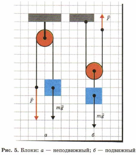 Материалы для повторения при подготовке к государственной итоговой аттестации Простые механизмыПростыми механизмами называют устройства, с помощью которых можно изменять модуль и направление силы. Примеры простых механизмов: неподвижный и подвижный блоки, наклонная плоскость, рычаг. БлокиС помощью неподвижного блока (рис. 5, а) можно только изменять направление действия силы. Он не дает выигрыша в силе. Подвижный блок (рис. 5, б) дает выигрыш в силе в 2 раза, если можно пренебречь трением и массой блока. Но при его использовании в 2 раза проигрывают в пути.