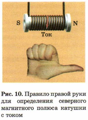Рис. 9. Взаимодействие параллельных проводников, по которым текут токи Магнитное действие тока используют в наушниках, громкоговорителях, электроизмерительных приборах, электродвигателях. Катушка с током обладает магнитными свойствами. Магнитные свойства катушки с током усиливаются, если внутрь катушки поместить стальной сердечник (такую катушку называют электромагнитом). С помощью мощных электромагнитов поднимают массивные стальные и железные детали, отделяют стальной и железный лом от других предметов. Правило правой руки для определения северного магнитного полюса катушки с током: если мысленно обхватить катушку с током правой рукой так, чтобы четыре пальца указывали направление тока, то отогнутый под прямым углом большой палец укажет, где находится северный магнитный полюс (рис. 10).