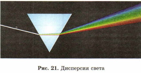 При прохождении сквозь треугольную стеклянную призму пучок белого света разлагается в спектр, содержащий все цвета радуги: красный, оранжевый, желтый, зеленый, голубой, синий, фиолетовый (рис. 21). Это означает, что белый свет является составным, то есть смесью всех цветов радуги.