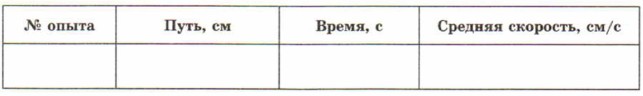 7. Вычислите средние скорости движения пузырька для каждого из проведенных опытов. Результаты вычислений занесите в таблицу. 8. Сравните значения средней скорости при разных значениях пройденного пути. На основании этого сделайте вывод: можно ли считать движение пузырька прямолинейным равномерным; запишите ваш вывод в тетрадь. Если движение пузырька можно считать равномерным, укажите его скорость. Если движение пузырька не является равномерным, укажите, увеличивалась или уменьшалась средняя скорость движения по мере увеличения пройденного пути. 9. Дополнительное задание (по предложению учителя). Повторите все измерения, увеличив угол наклона трубки (подложив 2—3 книги вместо одной). Сделайте вывод: как изменился характер движения пузырька вследствие изменения угла наклона трубки? Запишите сделанный вывод в тетрадь.