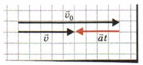 Если ускорение направлено противоположно начальной скорости 0, то векторные величины 0 и t направлены противоположно. Сложение векторных величин в этом случае показано на рис. 3.3. При этом υ = υ0 - at, то есть скорость v в момент времени t меньше начальной скорости. Это означает, что скорость тела уменьшается со временем.