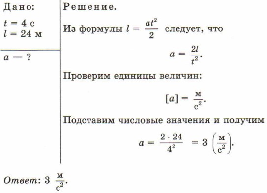 § 4. Путь при прямолинейном равноускоренном движении Движение без начальной скорости (окончание)РЕШИМ ЗАДАЧИ 1. Тело свободно падает из состояния покоя. Какое расстояние оно пролетит за 1 с? за 2 с? за вторую секунду падения? Решение. При свободном падении тело движется с ускорением свободного падения За вторую секунду тело пройдет путь l2 - l1 = 15 м. Ответ: 5 м; 20 м; 15 м. 2. Разгоняющийся с места автомобиль за 4 с проехал 24 м. Движение автомобиля можно считать равноускоренным. С каким ускорением он двигался?
