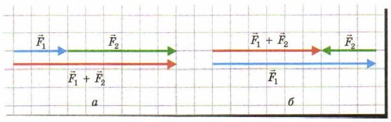 Если две силы направлены одинаково, их равнодействующая направлена так же, а модуль равнодействующей равен сумме модулей сил-слагаемых. На рис. 7.5, а приведен пример сложения таких сил. Силы-слагаемые обозначены синей и зеленой стрелками, а их равнодействующая — красной стрелкой. Если две не равные по модулю силы направлены противоположно, их равнодействующая направлена в сторону большей силы, а модуль равнодействующей равен разности модулей сил-слагаемых. На рис. 7.5, б приведен пример сложения таких сил.