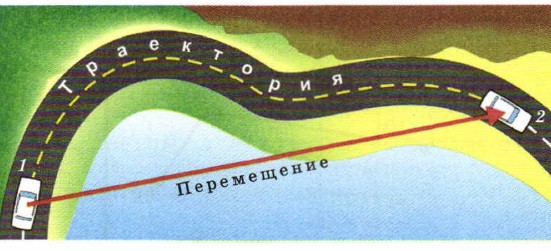 Рис. 1.8. Перемещение автомобиля, проехавшего из положения 1 в положение 2 Величины, которые подобно перемещению характеризуются числовым значением и направлением, называют векторными. При изучении механики мы встретимся и с другими векторными величинами, например, скоростью и силой. Числовое значение векторной величины называют модулем этой величины. Обозначают векторную величину буквой со стрелкой: например, перемещение обозначают На чертежах векторные величины изображают стрелками. Величины, которые характеризуются только числовым значением, называют скалярными. Примерами скалярных величин являются путь и время.