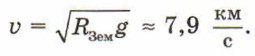 § 10. Закон всемирного тяготения Как найти первую космическую скоростьНайдем значение первой космической скорости, то есть скорости искусственного спутника Земли на околоземной орбите. Так называют орбиту, радиус которой практически равен радиусу Земли R3ем. На искусственный спутник, который движется по околоземной орбите, действует сила тяжести, равная по модулю mg, где g — ускорение свободного падения вблизи поверхности Земли. Под действием этой силы спутник движется с ускорением, равным по модулю g и направленным к центру Земли. С другой стороны, мы уже знаем (см. § 5. Равномерное движение по окружности), что если тело движется со скоростью υ по окружности радиусом R, то оно движется с ускорением