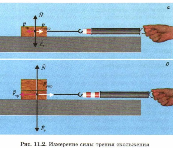 Повторим этот опыт, положив на брусок такой же второй брусок (рис. 11.2, б). Мы увидим, что сила трения скольжения увеличилась в 2 раза.