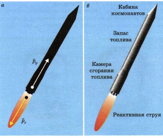 § 12. Импульс. Закон сохранения импульса Реактивное движениеВы уже знаете, что скорость тела может изменяться только в результате действия на это тело других тел. Например, бегун разгоняется, отталкиваясь от дороги: при этом, согласно третьему закону Ньютона, дорога толкает бегуна вперед. А от чего же отталкивается ракета, разгоняясь в открытом космосе? От того, что она взяла с собой в полет! Из сопла ракеты с огромной скоростью вылетают продукты сгорания топлива (раскаленные газы), приобретая импульс, направленный назад. При этом согласно закону сохранения импульса сама ракета получает импульс, направленный вперед. Это схематически изображено на рис. 12.3, а, где