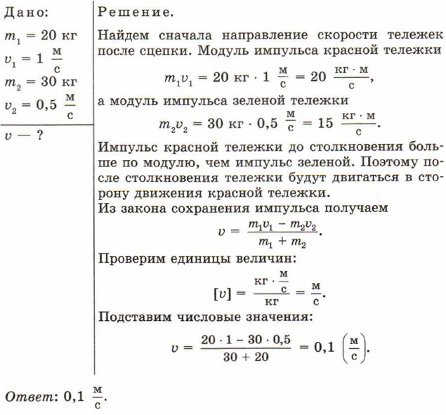Две тележки едут навстречу друг другу. Масса красной тележки 20 кг, а масса зеленой 30 кг. Скорости тележек равны соответственно 1 и Тележки сцепляются. Как направлена скорость тележек после сцепки: в сторону движения красной или зеленой тележки? Чему равна эта скорость? Трением можно пренебречь.