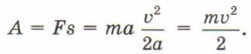 § 13. Механическая работа. Мощность Какую работу надо совершить, чтобы разогнать телоНайдем работу, которую надо совершить, чтобы разогнать покоящееся вначале тело массой m до скорости, равной по модулю υ. Пусть на тело действует постоянная сила А = Fs, где s — модуль перемещения. Согласно второму закону Ньютона F = mа, где а — модуль ускорения тела. При движении без начальной скорости