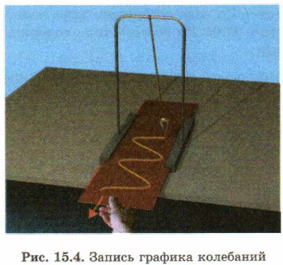 § 15. Механические колебания Гармонические колебанияВозьмем в качестве груза для маятника небольшой сосуд в форме перевернутого конуса с малым отверстием в вершине. Насыплем в сосуд мелкий сухой песок. При колебаниях маятника высыпающийся тонкой струйкой песок будет «рисовать» на равномерно движущемся листе картона график зависимости смещения груза от времени (рис. 15.4). Этот волнообразный график называют синусоидой.