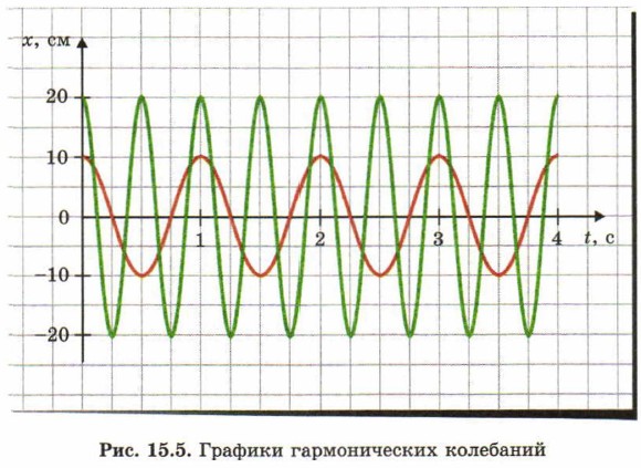 Колебания, при которых смещение тела от положения равновесия изменяется по закону синуса (или косинуса) называют гармоническими. На рис. 15.5 приведены графики зависимости смещения двух гармонически колеблющихся тел от времени. Амплитуда колебаний тела, график которого изображен красной линией, равна 10 см, а период колебаний 1 с.