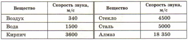 Мы видим, что скорость звука в разных средах отличается в десятки раз. Можно заметить, что скорость звука в жидкостях намного больше, чем в газах, а в твердых телах — еще больше. Наибольшая скорость звука в самом твердом из известных веществ — в алмазе.