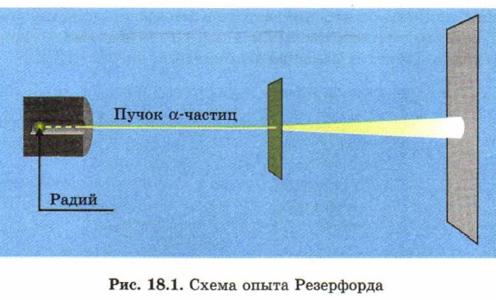 Резерфорд поставил такой опыт. Малое количество радия поместили на дно узкого канала, просверленного в свинцовом цилиндре (рис. 18.1). Из канала выходил параллельный пучок α-частиц и падал на тонкую металлическую фольгу. За фольгой находился экран, покрытый веществом, которое светилось при попадании на него α-частиц. По светящимся точкам на экране можно было изучать, как отклоняются α-частицы, когда они сталкиваются с атомами, из которых состоит фольга.