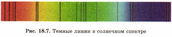 § 18. Строение атома. Испускание и поглощение света атомами Спектры поглощенияВ начале 19-го века английский ученый У. Волластон и независимо от него немецкий ученый Й. Фраунгофер, изучая с помощью спектроскопа солнечный спектр, обнаружили на фоне сплошного спектра загадочные темные линии (рис. 18.7), названные впоследствии фраунгоферовыми.