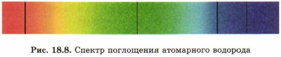 Опыты подтвердили это предположение. На рис. 18.8 в качестве примера приведен спектр поглощения атомарного водорода. Сравните его со спектром излучения атомарного водорода, приведенным на рис. 18.6.