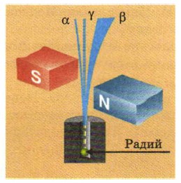Проходя между полюсами магнита, направленный пучок излучения расщепляется на три пучка. Резерфорд назвал их α-, β- и γ-лучами.