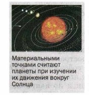 При описании движения тела, имеющего размеры, возникают и другие вопросы. Например, что следует понимать под скоростью тела, если оно, перемещаясь в пространстве, одновременно вращается вокруг собственной оси? Ведь скорость разных точек этого тела будет различна как по модулю, так и по направлению. Например, при суточном вращении Земли диаметрально противоположные её точки движутся в противоположных направлениях, причём чем ближе к оси расположена точка, тем меньше её скорость. Каким же образом можно задать координату, скорость и другие характеристики движения тела, имеющего размеры? Оказывается, во многих случаях вместо движения реального тела можно рассматривать движение так называемой материальной точки, т. е. точки, обладающей массой этого тела. Для материальной точки можно однозначно определить координату, скорость и другие физические величины, так как она не имеет размеров и не может вращаться вокруг собственной оси. Материальных точек нет в природе. Материальная точка — это понятие, использование которого упрощает решение многих задач и при этом позволяет получить достаточно точные результаты. Тело можно считать материальной точкой в тех случаях, когда его размерами (а значит, и формой, и вращением) можно пренебречь, поскольку они несущественны в условиях решаемой задачи.