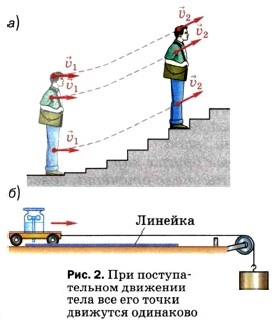 Но при решении задач, связанных с суточным вращением планет (например, при определении времени восхода солнца в разных местах поверхности земного шара), считать планету материальной точкой бессмысленно, так как результат задачи зависит от размеров этой планеты и скорости движения точек её поверхности. Так, например, во Владимирской часовой зоне солнце взойдёт на 1 ч позже, в Иркутской — на 2 ч позже, а в Московской — на 8 ч позже, чем в Магаданской. За материальную точку правомерно принять самолёт, если требуется, например, определить среднюю скорость его движения на пути из Тело, движущееся поступательно1, можно принимать за материальную точку даже в том случае, если его размеры соизмеримы с проходимыми им расстояниями. Например, поступательно движется человек, стоящий на ступеньке движущегося эскалатора (рис. 2, а). 1 Поступательное движение — движение тела, при котором прямая, соединяющая любые две точки этого тела, перемещается, оставаясь всё время параллельной своему первоначальному направлению. Поступательным может быть как прямолинейное, так и криволинейное движение. Например, поступательно движется кабина колеса обозрения. В любой момент времени все точки тела человека движутся одинаково. Поэтому если мы хотим описать движение человека (т. е. определить, как меняется со временем его скорость, путь и т. д.), то достаточно рассмотреть движение только одной его точки. При этом решение задачи значительно упрощается.