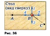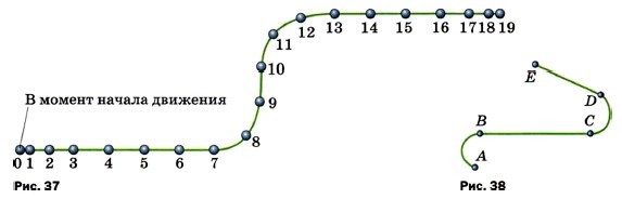 1. Шарик катился по горизонтальной поверхности стола от точки А к точке В (рис. 36). В точке В на шарик подействовали силой 2. На рисунке 37 изображена траектория движения шарика. На ней отмечены положения шарика через каждую секунду после начала движения. Действовала ли на шарик сила на участке 0—3; 4—6; 7—9; 10—12; 13—15; 16—19? Если сила действовала, то как она была направлена по отношению к вектору скорости? Почему на участке 7—9 шарик повернул налево, а на участке 10—12 — направо по отношению к направлению движения перед поворотом? Сопротивление движению не учитывайте.