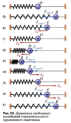 Переместим шарик в точку В (рис. 53, б). Пружина при этом растянется, и в ней возникнет сила упругости Если отпустить шарик, то под действием силы упругости он начнёт ускоренно перемещаться влево, к точке О. Направление силы упругости и вызванного ею ускорения будет совпадать с направлением скорости шарика, поэтому по мере приближения шарика к точке О его скорость будет всё время возрастать. При этом сила упругости с уменьшением деформации пружины будет уменьшаться (рис. 53, в). Напомним, что любое тело обладает свойством сохранять свою скорость, если на него не действуют силы или если равнодействующая сил равна нулю. Поэтому, дойдя до положения равновесия (рис. 53, г), где сила упругости станет равна нулю, шарик не остановится, а будет продолжать двигаться влево. При его движении от точки О к точке А пружина будет сжиматься. В ней снова возникнет сила упругости, которая и в этом случае будет направлена к положению равновесия (рис. 53, д, е). Поскольку сила упругости направлена против скорости движения шарика, то она тормозит его движение. В результате в точке А шарик остановится. Сила упругости, направленная к точке О, будет продолжать действовать, поэтому шарик вновь придёт в движение и на участке АО его скорость будет возрастать (рис. 53, е, ж, з). Движение шарика от точки О к точке В снова приведёт к растяжению пружины, вследствие чего опять возникнет сила упругости, направленная к положению равновесия и замедляющая движение шарика до полной его остановки (рис. 53, з, и, к). Таким образом, шарик совершит одно полное колебание. При этом в каждой точке его траектории (кроме точки О) на него будет действовать сила упругости пружины, направленная к положению равновесия. Под действием силы, возвращающей тело в положение равновесия, тело может совершать колебания как бы само по себе. Первоначально эта сила возникла благодаря тому, что мы совершили работу по растяжению пружины, сообщив ей некоторый запас энергии. За счёт этой энергии и происходили колебания.