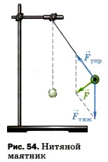 Свободно колеблющиеся тела всегда взаимодействуют с другими телами и вместе с ними образуют систему тел, которая получила название колебательной системы. В рассмотренном примере в колебательную систему входят шарик, пружина и вертикальная стойка, к которой прикреплён левый конец пружины. В результате взаимодействия этих тел и возникает сила, возвращающая шарик к положению равновесия. На рисунке 54 изображена колебательная система, состоящая из шарика, нити, штатива и Земли (Земля на рисунке не показана). В данном случае шарик совершает свободные колебания под действием двух сил: силы тяжести и силы упругости нити. Их равнодействующая направлена к положению равновесия.