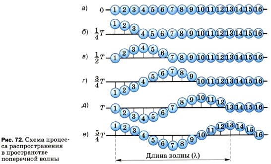 Глава 2. Механические колебания и волны. Звук § 29. Длина волны. Скорость распространения волнРассмотрим более подробно процесс передачи колебаний от точки к точке при распространении поперечной волны. Для этого обратимся к рисунку 72, на котором показаны различные стадии процесса распространения поперечной волны через промежутки времени, равные 1/4 Т. На рисунке 72, (а) изображена цепочка пронумерованных шариков. Это модель: шарики символизируют частицы среды. Будем считать, что между шариками, как и между частицами среды, существуют силы взаимодействия, в частности при небольшом удалении шариков друг от друга возникает сила притяжения.