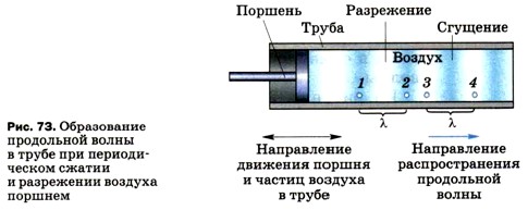 Формулы для нахождения скорости волны справедливы как для поперечных, так и для продольных волн. Длину волны λ при распространении продольных волн можно представить с помощью рисунка 73. На нём изображена (в разрезе) труба с поршнем. Поршень совершает колебания с небольшой амплитудой вдоль трубы. Его движения передаются прилегающим к нему слоям воздуха, заполняющего трубу. Колебательный процесс постепенно распространяется вправо, образуя в воздухе разрежения и сгущения.