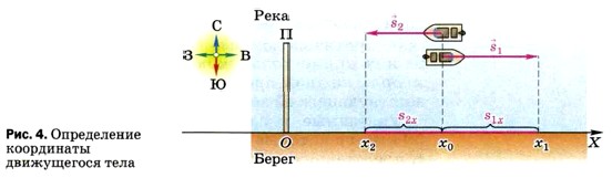 Глава 1. Законы взаимодействия и движения тел § 3. Определение координаты движущегося телаВ предыдущем параграфе говорилось о том, что положение тела, совершившего некоторое перемещение, можно найти графически, отложив вектор перемещения от начального положения этого тела. Но в большинстве случаев необходимо вычислить положение тела, т. е. определить его координаты. Известно, что вычисления производят не с векторами, а с соответствующими им скалярными величинами: с проекциями векторов на координатные оси и с модулями векторов или их проекций (т. е. с величинами, представляющими собой положительные или отрицательные числа, но не имеющими направления). Покажем, как определить координату движущегося тела, зная координату его начального положения и вектор перемещения. Для этого решим задачу. Два катера идут по реке в противоположных направлениях и встречаются в 100 км к востоку от пристани П (рис. 4). Продолжая движение, за некоторый промежуток времени t первый катер переместился от места встречи на 60 км к востоку, а второй — на 50 км к западу. Определите координаты каждого катера относительно пристани и расстояние между катерами через промежуток времени t после их встречи. Проведём координатную ось ОХ параллельно прямой, вдоль которой движутся катера, и направим её на восток. Начало этой оси (х = 0) — точку О — совместим с пристанью, приняв её за тело отсчёта (поскольку в задаче требуется определить положение катеров по отношению к пристани).