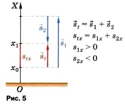 2. Мальчик держит в руках мяч на высоте 1 м от поверхности земли. Затем он подбрасывает мяч вертикально вверх. За некоторый промежуток времени t мяч успевает подняться на 2,4 м от своего первоначального положения, достигнув при этом точки наибольшего подъёма, и опуститься от этой точки на 1,25 м (рис. 5). Пользуясь этим рисунком, определите: а) координату х0 начального положения мяча; б) проекцию stx вектора перемещения