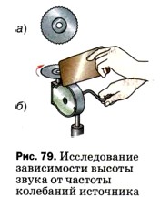 Проверим этот вывод на другом опыте. Возьмём зубчатый диск (рис. 79, а), с помощью специального устройства приведём его во вращение и прикоснёмся к зубчатому краю тонкой картонной пластинкой (рис. 79, б). Под воздействием зубьев вращающегося диска пластинка начнёт совершать вынужденные колебания, в результате чего мы услышим звук. Увеличим скорость вращения диска, и пластинка станет колебаться чаще, а издаваемый ею звук будет выше. На основании описанного опыта можно заключить, что высота звука зависит от частоты колебаний: чем больше частота колебаний источника звука, тем выше издаваемый им звук. Напомним, что ветви камертона совершают гармонические (синусоидальные) колебания, которые являются самым простым видом колебаний. Таким колебаниям присуща только одна строго определённая частота. Звук камертона является чистым тоном.
