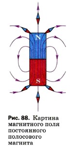Рассмотрим картину линий магнитного поля постоянного полосового магнита (рис. 88). Из курса физики 8 класса вы знаете, что магнитные линии выходят из северного полюса магнита и входят в южный. Внутри магнита они направлены от южного полюса к северному. Магнитные линии не имеют ни начала, ни конца: они либо замкнуты, либо, как средняя линия на рисунке, идут из бесконечности в бесконечность. Вне магнита магнитные линии расположены наиболее густо у его полюсов. Значит, возле полюсов поле самое сильное, а по мере удаления от полюсов оно ослабевает. Чем ближе к полюсу магнита расположена магнитная стрелка, тем с большей по модулю силой действует на неё поле магнита. Поскольку магнитные линии искривлены, то направление силы, с которой поле действует на стрелку, тоже меняется от точки к точке.