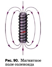 На рисунке 90 показано магнитное поле, возникающее внутри соленоида — проволочной цилиндрической катушки с током. Поле внутри соленоида можно считать однородным, если длина соленоида значительно больше его диаметра (вне соленоида поле неоднородно, его магнитные линии расположены примерно так же, как у полосового магнита). Из этого рисунка видно, что магнитные линии однородного магнитного поля параллельны друг другу и расположены с одинаковой густотой. Однородным является также поле внутри постоянного полосового магнита в центральной его части (см. рис. 88). Для изображения магнитного поля пользуются следующим приёмом. Если линии однородного магнитного поля расположены перпендикулярно к плоскости чертежа и направлены от нас за чертёж, то их изображают крестиками (рис. 91, а), а если из-за чертежа к нам — то точками (рис. 91, б). Как и в случае с током, каждый крестик — это как бы видимое нами хвостовое оперение летящей от нас стрелы, а точка — острие стрелы, летящей к нам (на обоих рисунках направление стрел совпадает с направлением магнитных линий). Вопросы1. Что является источником магнитного поля?