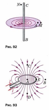 1. На рисунке 92 изображён участок ВС проводника с током. Вокруг него в одной из плоскостей показаны линии магнитного поля, созданного этим током. Существует ли магнитное поле в точке А? 2. В какой из точек — А, М или N (см. рис. 92) — магнитное поле тока, протекающего по участку ВС проводника, будет действовать на магнитную стрелку с наибольшей силой; с наименьшей силой? 3. На рисунке 93 изображён проволочный виток с током и линии магнитного поля, создаваемого этим током. а) Есть ли среди указанных на рисунке точек А, В, С и D такие, в которых поле действовало бы на магнитную стрелку с одинаковой по модулю силой? (АС = AD, АЕ = BE.) Если такие точки есть, укажите их.