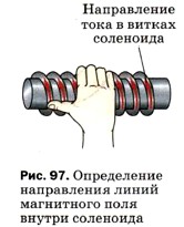 Для определения направления линий магнитного поля соленоида удобнее пользоваться другим правилом, которое иногда называют правилом правой руки. Это правило формулируется так: если обхватить соленоид ладонью правой руки, направив четыре пальца по направлению тока в витках, то отставленный большой палец покажет направление линий магнитного поля внутри соленоида (рис. 97). Вы уже знаете, что магнитное поле соленоида (см. рис. 90) подобно полю постоянного полосового магнита (см. рис. 88). Соленоид, как и магнит, имеет полюсы: тот конец соленоида, из которого магнитные линии выходят, является северным полюсом, а тот, в который входят, — южным. Зная направление тока в соленоиде, по правилу правой руки можно определить направление магнитных линий поля внутри него, а значит, и его магнитные полюсы. И наоборот, по направлению магнитных линий поля внутри соленоида или расположению его полюсов можно определить направление тока в витках соленоида. Правило правой руки можно применять и для определения направления линий магнитного поля в центре витка с током. Вопросы1. Опишите опыт, подтверждающий связь между направлением тока в проводнике и направлением линий магнитного поля, созданного проводником.