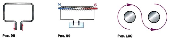 Упражнение 321. На рисунке 98 изображён проволочный прямоугольник, направление тока в нём показано стрелками. Перечертите рисунок в тетрадь и, пользуясь правилом буравчика, начертите вокруг каждой из его четырёх сторон по одной магнитной линии, указав стрелкой её направление. 2. Определите направление тока в катушке и полюсы источника тока (рис. 99), если при прохождении тока в катушке возникают указанные на рисунке магнитные полюсы. 3. Направление тока в витках обмотки подковообразного электромагнита показано стрелками (рис. 100). Определите полюсы электромагнита. 4*. Параллельные провода, по которым текут токи одного направления, притягиваются, а параллельные пучки электронов, движущихся в одном направлении, отталкиваются. В каком из этих случаев взаимодействие обусловлено электрическими силами, а в каком — магнитными? Почему вы так считаете?