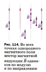 Данное определение линий магнитной индукции можно пояснить с помощью рисунка 113. На нём изображён проводник с током, расположенный перпендикулярно плоскости чертежа. Окружность вокруг проводника представляет собой одну из линий индукции магнитного поля, созданного протекающим по проводнику током. Проведённые к этой окружности касательные в любой точке совпадают с вектором магнитной индукции. Теперь, пользуясь термином «магнитная индукция», назовём основные признаки однородного и неоднородного магнитных полей. В однородном магнитном поле (рис. 114) вектор магнитной индукции Сравним это поле с двумя неоднородными полями: полем постоянного полосового магнита (рис. 115, а) и полем тока, протекающего по прямолинейному участку проводника (рис. 115, б).
