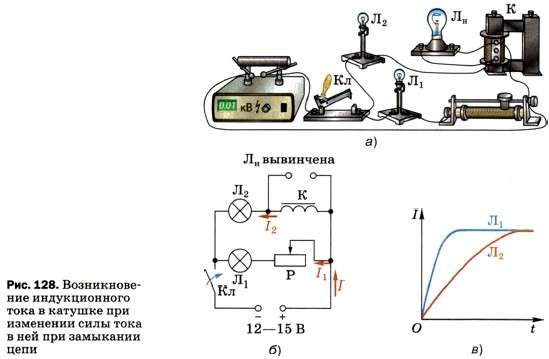 где L — индуктивность проводника, i — сила тока в этом проводнике. Вопросы1. Какое явление изучалось на опыте, представленном на рисунках 128 и 129?