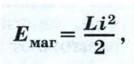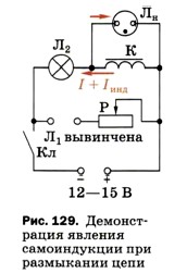 Теперь посмотрим, что будет происходить при размыкании цепи. Для этого неоновую лампу Лн поместим в патрон, а лампу Л1 вывинтим, разомкнув тем самым участок цепи с реостатом (рис. 129). При замыкании цепи загорится только лампа Л2. Неоновая лампа не включается потому, что напряжение, необходимое для её зажигания, значительно больше напряжения, подаваемого от источника тока. Теперь разомкнём цепь — лампа накаливания гаснет, зато неоновая даёт яркую кратковременную вспышку. Значит, уменьшение тока при размыкании цепи создаёт настолько мощный индукционный ток, противодействующий уменьшению тока в катушке, что напряжение на ней оказывается достаточным для зажигания лампы (и значительно превышающим напряжение источника!). В проделанном опыте мы наблюдали явление самоиндукции. Явление самоиндукции заключается в возникновении индукционного тока в катушке при изменении силы тока в ней. При этом возникающий индукционный ток называется током самоиндукции. Конечно, ток самоиндукции возникает не только в катушках, но и в любых других проводниках, если сила тока изменяется. Но, как уже отмечалось, в катушках с относительно небольшим числом витков, не имеющих сердечника, и тем более в прямых проводниках (т. е. в элементах цепи, обладающих малой индуктивностью) ток самоиндукции обычно невелик и не оказывает существенного влияния на процессы в электрической цепи. Появление мощного индукционного тока при размыкании цепи свидетельствует о том, что магнитное поле тока в катушке обладает энергией. Именно за счёт уменьшения энергии магнитного поля совершается работа по созданию индукционного тока. А накопилась эта энергия раньше, при замыкании цепи, когда за счёт энергии источника тока совершалась работа по преодолению тока самоиндукции, препятствующего увеличению тока в цепи, и его магнитного поля. Энергия магнитного поля тока определяется по формуле