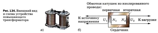 Поэтому существенного снижения потерь Q можно добиться только за счёт уменьшения силы тока I. Но при этом необходимо во столько же раз увеличить получаемое от генератора напряжение U, чтобы не снижать мощность тока Р (так как Р = UI 1). Без такого преобразования силы тока и напряжения передача электроэнергии на большие расстояния становится невыгодной из-за существенных потерь. Решение этой важнейшей технической задачи стало возможным только после изобретения трансформатора — устройства, предназначенного для увеличения или уменьшения переменного напряжения и силы тока. Трансформатор был изобретён в 1876 г. русским учёным Павлом Николаевичем Яблочковым. В основе его работы лежит явление электромагнитной индукции. На рисунке 134, (а) показан внешний вид трансформатора, а на рисунке 134, (б) схематично изображены его основные части. Обратите внимание на то, что число витков в обмотках различно: в данном случае N2 > N1. 1 U, I — так называемые действующие значения напряжения и силы переменного тока. Они равны соответственно напряжению и силе постоянного тока, выделяющего в проводнике ежесекундно столько же тепла, что и переменный ток. Действующие значения напряжения и силы переменного тока в Протекающий в первичной обмотке переменный ток создаёт (главным образом в сердечнике) переменное магнитное поле, которое, в свою очередь, порождает переменное электрическое поле. В результате действия этого поля на концах вторичной обмотки возникает переменное напряжение U2.