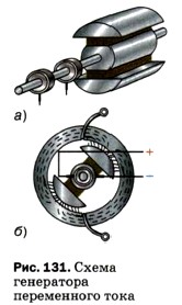 Магнитное поле создаётся ротором (рис. 131, а). Он представляет собой электромагнит: на стальной сердечник сложной формы надета обмотка, по которой протекает постоянный электрический ток. Ток к этой обмотке подводится через щётки и кольца от постороннего источника постоянного тока. На рисунке 131, (б) приведена схема генератора переменного тока. Штрихами показано примерное расположение линий индукции магнитного поля ротора. При вращении ротора какой-либо внешней механической силой создаваемое им магнитное поле тоже вращается. При этом магнитный поток, пронизывающий витки обмотки статора, периодически меняется, в результате чего в них индуцируется переменный ток. На тепловых электростанциях ротор генератора вращается с помощью паровой турбины, на гидроэлектростанциях — с помощью водяной турбины.
