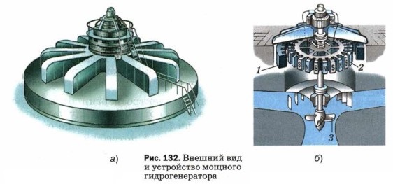 На рисунке 132, а изображён внешний вид мощного гидрогенератора, а на рисунке 132, (б) схематично показано его устройство, где цифрой 1 обозначен статор, цифрой 2 — ротор, а цифрой 3 — водяная турбина. Ротор гидрогенератора имеет не одну, а несколько пар магнитных полюсов. Чем больше пар полюсов, тем больше частота переменного электрического тока, вырабатываемого генератором при данной скорости вращения ротора. Поскольку скорость вращения водяных турбин обычно невелика, то для создания тока стандартной частоты используют многополюсные роторы.